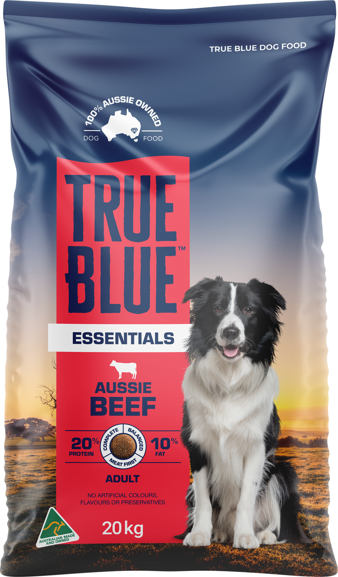 True Blue Essentials Dry Dog Food – Beef 20kg True Blue Essentials Beef Dry Dog Food 20kg offers a reliable, no-nonsense diet crafted to keep your dog healthy, active, and satisfied. Made using quality Australian ingredients and backed by practical Aussie know-how, this everyday formula delivers the core nutrition your dog needs — with no artificial colours, flavours, or preservatives. Features & Benefits - 20% Protein – Supports muscle development, tissue repair, and healthy growth. - 10% Fat – Delivers essential fatty acids and steady energy for overall vitality. - Bright Eyes – Vitamins and minerals help maintain general wellbeing and eye clarity. - Healthy Skin & Coat – Omega-6 fatty acids promote a shiny coat and nourished skin. - Strong Teeth & Bones – Added calcium encourages bone strength and dental health. - Better Digestion – Balanced ingredients contribute to smaller, firmer stools. - Natural Feeding – Completely free from artificial additives for a cleaner, more wholesome diet.